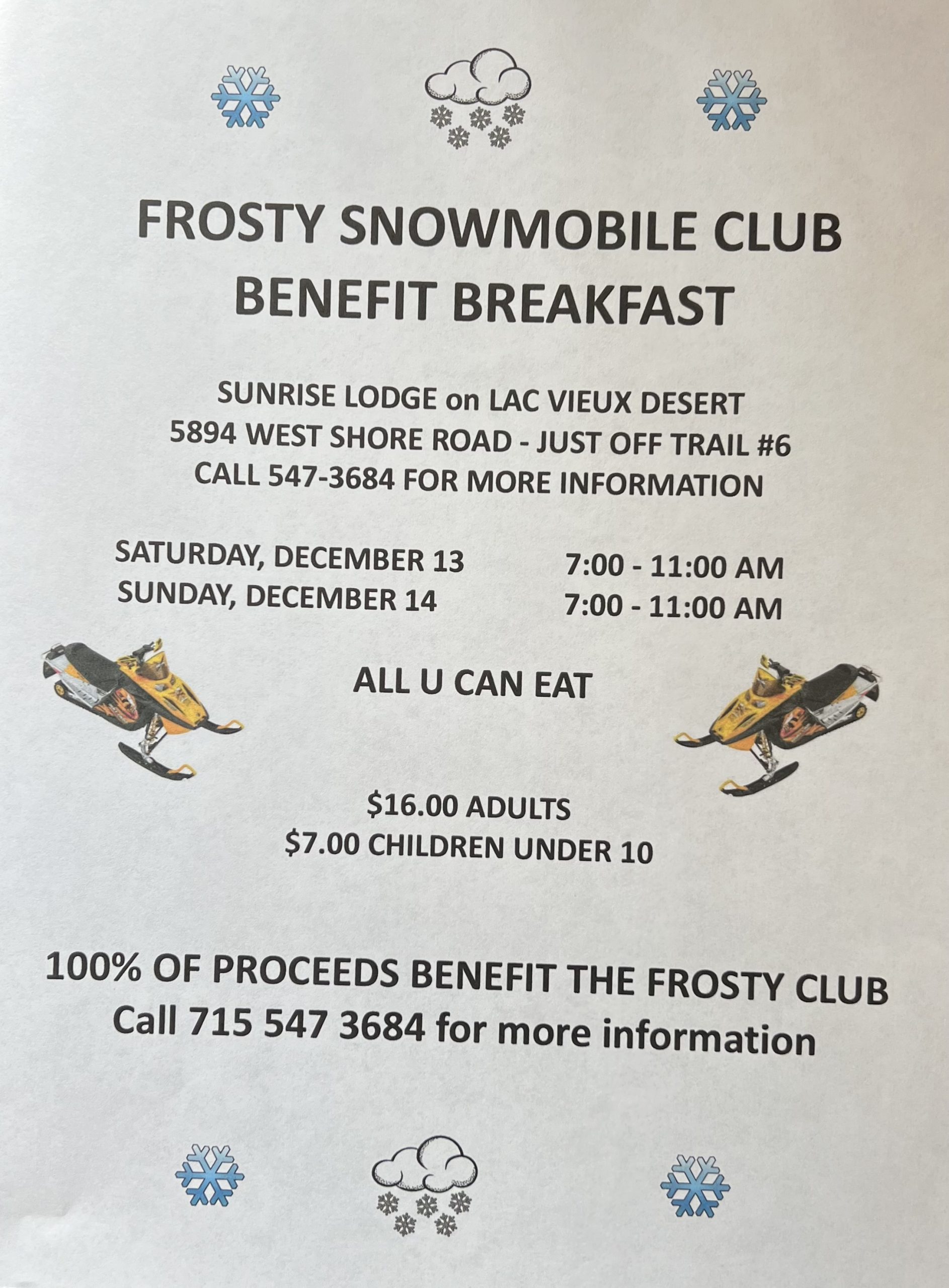 Join the Frosty Snowmobile Club for Breakfast on Saturday December 13 and Sunday December 14th at Sunrise Lodge on Lac Vieux Desert. 100% of the proceeds benefit The Frosty Club. Click here to see the Poster